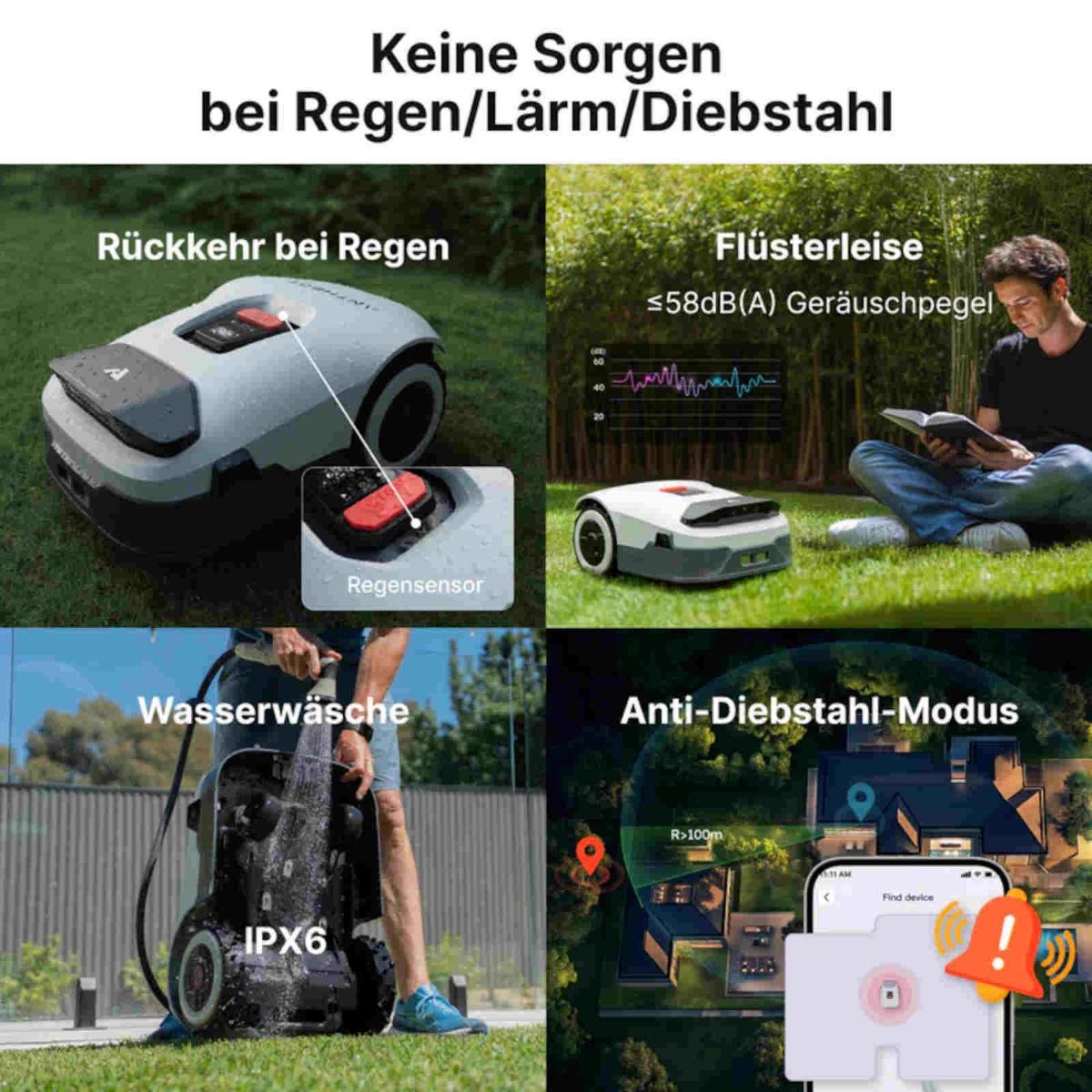 Die App-Steuerung ermöglicht Ihnen, Zonen zu definieren, Zeitpläne zu setzen oder Änderungen vorzunehmen - direkt vom Smartphone aus. Auch in schwer erreichbaren Bereichen überzeugt das Gerät: Er bewältigt Steigungen bis zu 45 % Gefälle zuverlässig und meistert unebenes Gelände dank intelligenter Federung und stabilem Fahrwerk. Beim Kantenschneiden fährt er akkurat direkt entlang von Rasenflächen und Wegen, sodass kein Nachschnitt erforderlich ist.