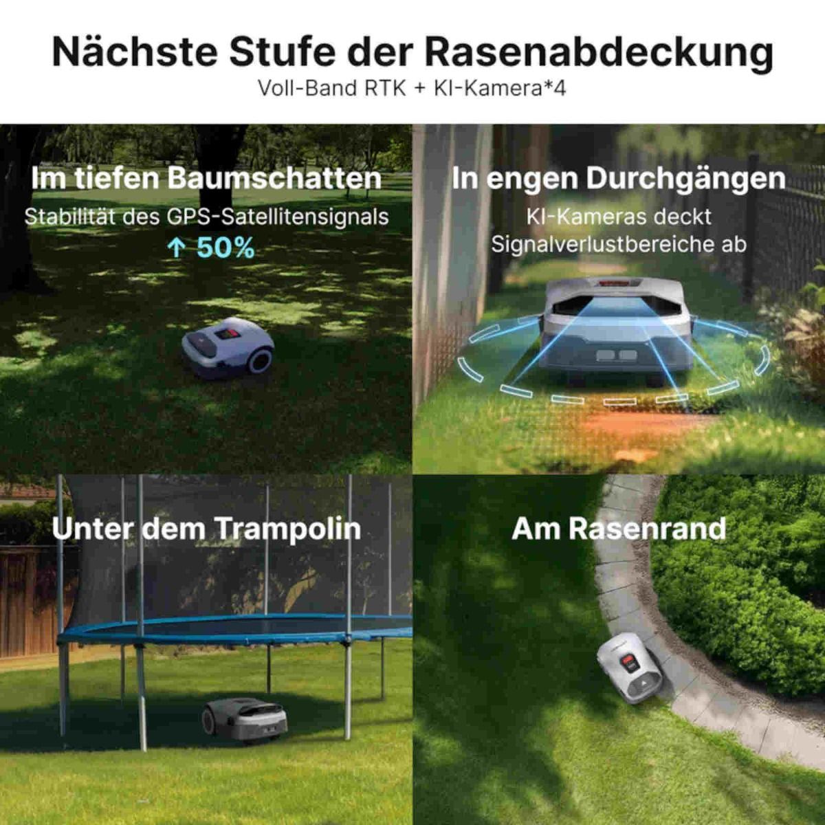 Das System nutzt RTK‑GNSS zur Hochpräzisionspositionierung und vier Kameras zur dreidimensionalen Umgebungserfassung. So wird die Rasenfläche millimetergenau bestimmt und Hindernisse erkannt.