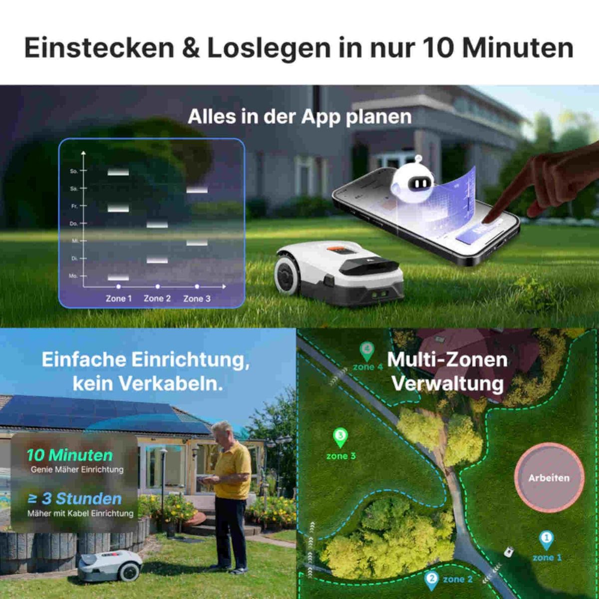 Mit der RTK + 4 Kamera 3D Vision erreicht der Genie 1000 Mähroboter eine zentimetergenaue Navigation - selbst komplexe Rasenflächen werden exakt abgefahren. In der Einleitung erlaubt diese Technologie ein effizienteres Mähen mit minimalem Überlapp. Der Genie 1000 bietet 10‑Minuten KI-gestützte Kartierung: Nach Inbetriebnahme erkennt er innerhalb von zehn Minuten das Gelände, Zonen und Hindernisse - so ist sofortiger Einsatz möglich.