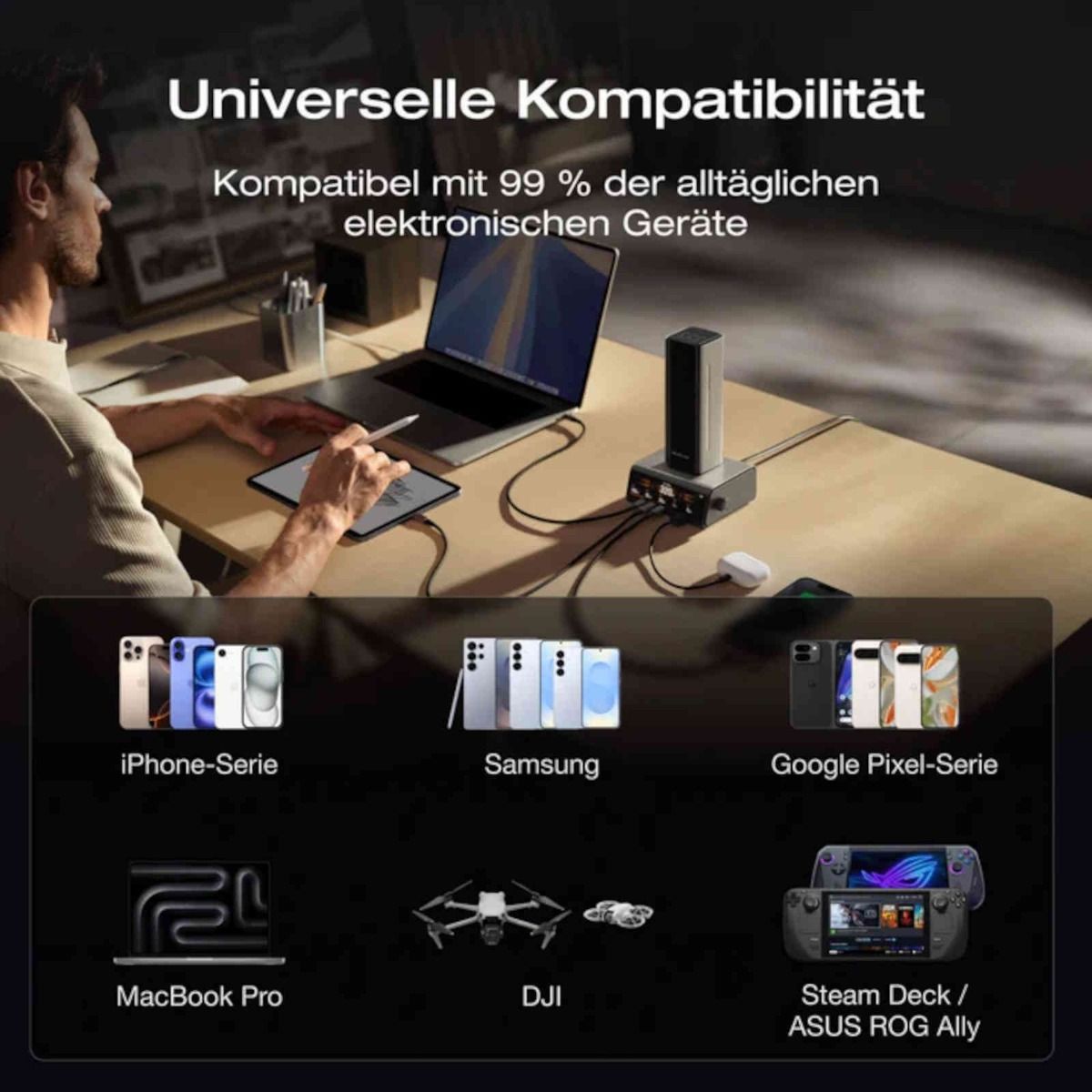 • Sehr hohe Ladeleistung: 300 W Gesamtleistung, 140 W USB‑C für laptops.