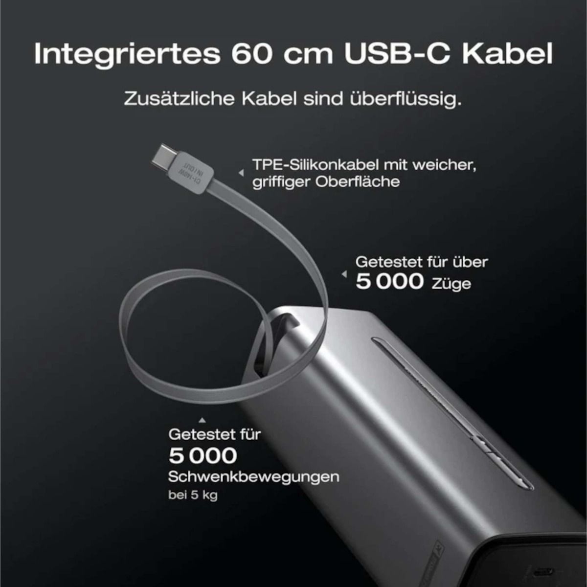 • Integriertes 140 W USB‑C Kabel (60 cm): kein zusätzliches Kabel nötig.
