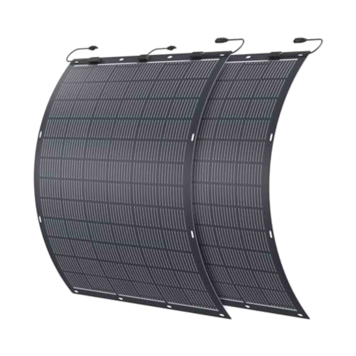 Zendure 1680W Rigid Solar Panel kombiniert mit Zendure Powerstation für stationäre Energieanwendungen. Stabiles Zendure 1680W Rigid Solar Panel mit integriertem Standfuß in geneigter Position. Zwei flexible Zendure Solarpanels in gebogener Bauform für mobile Energieinstallationen.